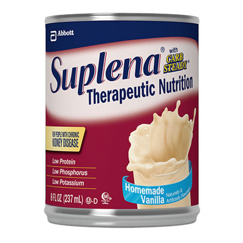 Suplena Homemade Vanilla, 425 calories per 8 oz. (237 mL) carton. Suplena with CARBSTEADY is therapeutic nutrition specifically designed for people with Stage 3/4 chronic kidney disease, or nondialyzed without protein energy wasting (malnutrition). For tube or oral feeding. For supplemental or sole-source nutrition. Use under medical supervision.